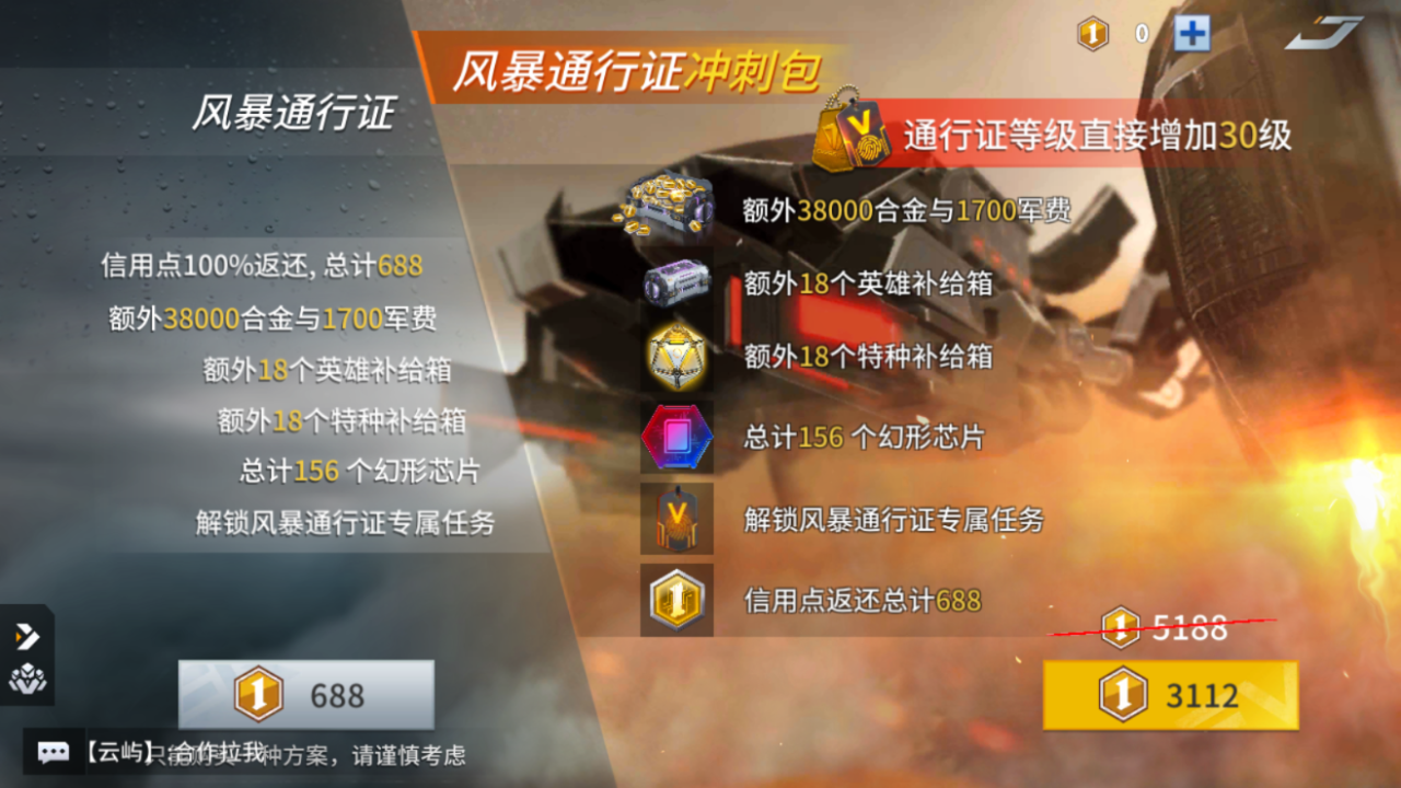 2、风暴通行证冲刺包:返还所有的信用点,总共有688、额外得到3.8w合金和军费、18个补给箱子、18个特殊补给箱子、156个芯片、解锁专属风暴任务。并且还能直接把通行证升到30级。