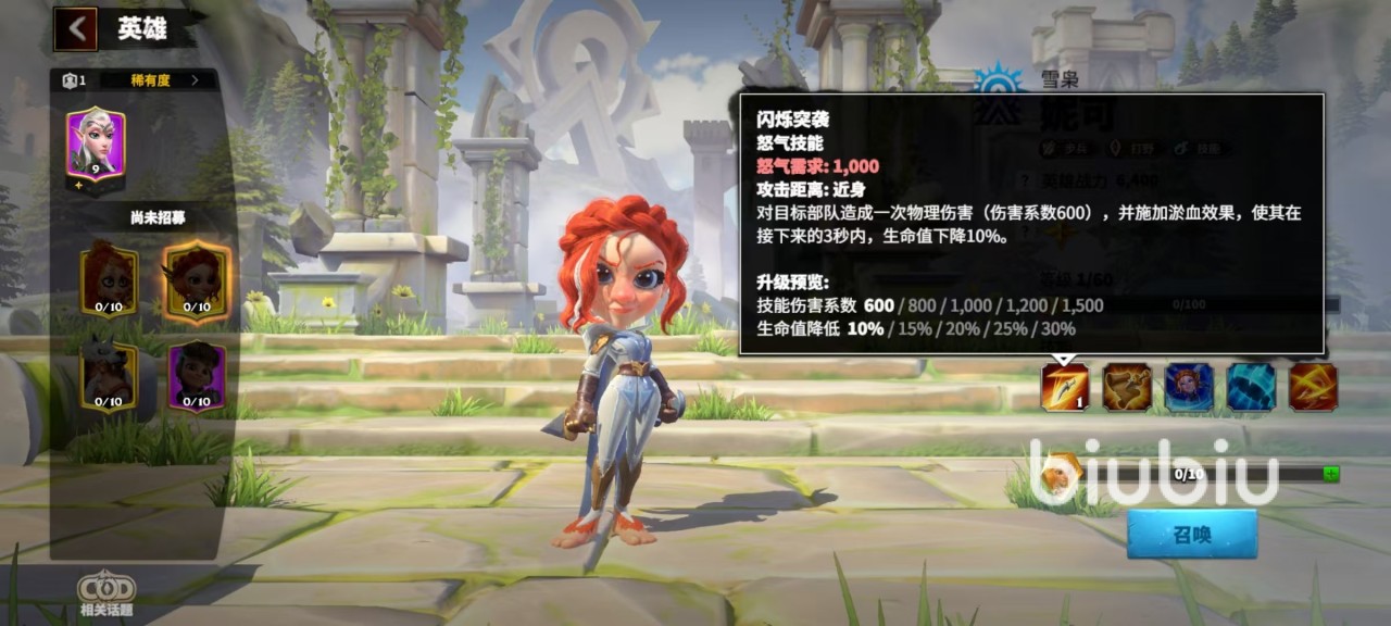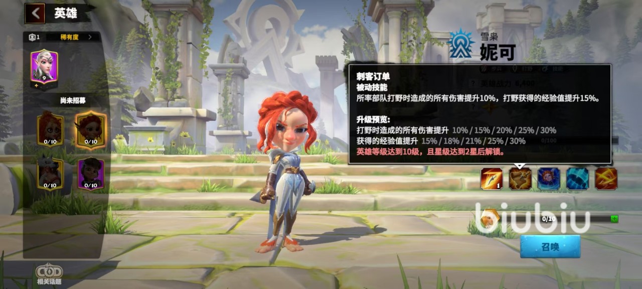 妮可是打野类型中的步兵英雄,他的怒气技能可以对目标造成物理伤害,并施加淤血效果。接下来的三秒内,对方生命值下降,该技能的伤害系数最多能达到1500,生命值降低比例能提升到30%,这也是很有用的伤害技能。他的被动技能刺客订单,能够增加部队打野时的伤害,和打野时获得的经验,造成的伤害提升能达到30%,获得的经验提升也能达到30%。这样在打野的时候不仅伤害高,更是可以快速获得经验发育起来,可以成为大家手中的专职打野英雄。在其他被动的影响下,步兵单位的物理攻击力提升,行军速度提升,提升了行军速度后也有助于在地图上快速移动打野。