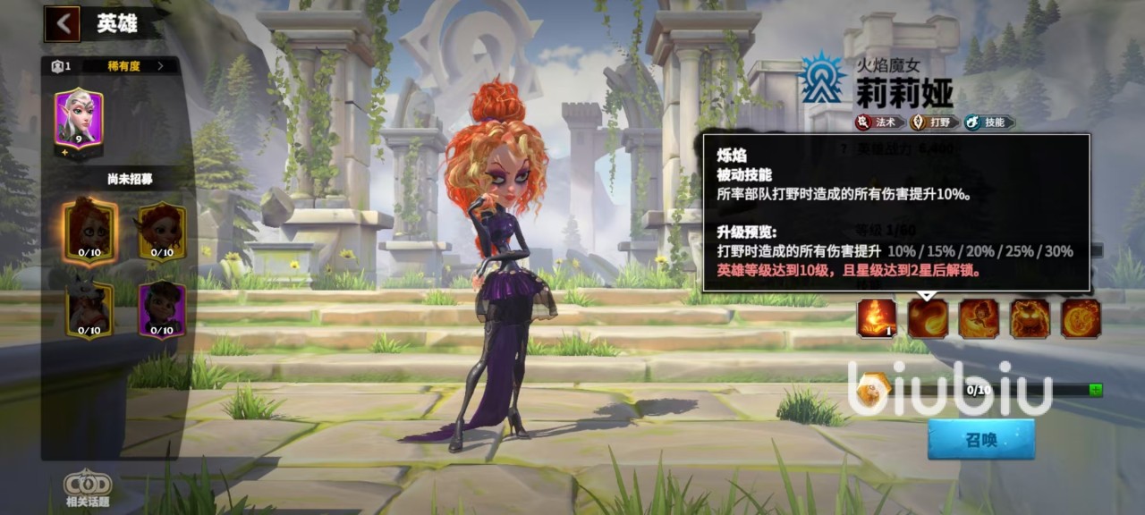 技能的伤害系数最多能提升到1200,灼烧概率最多能提升到50%,在打野的过程中灼烧是很有用的伤害效果、莉莉娅还具有一个很关键的被动技能,能够使所帅部队在打野时造成的伤害最多提升30%,这也是其成为最好用的打野英雄的重要原因。在其他被动技能的影响下,部队魔法攻击力提升,生命值提升。在攻击带有灼烧效果的目标时有几率继续施加灼烧。