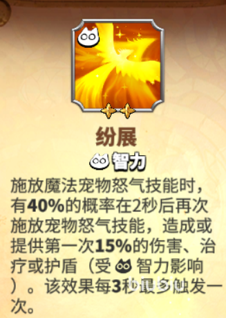纷展:第1次施法之后,宠物有40%的概率,在两秒之后再次释放怒气技能,造成或者提供第1次伤害的15%伤害、治疗量或者护盾值。效果受到宠物的智力值影响,最多三秒之内触发一次。