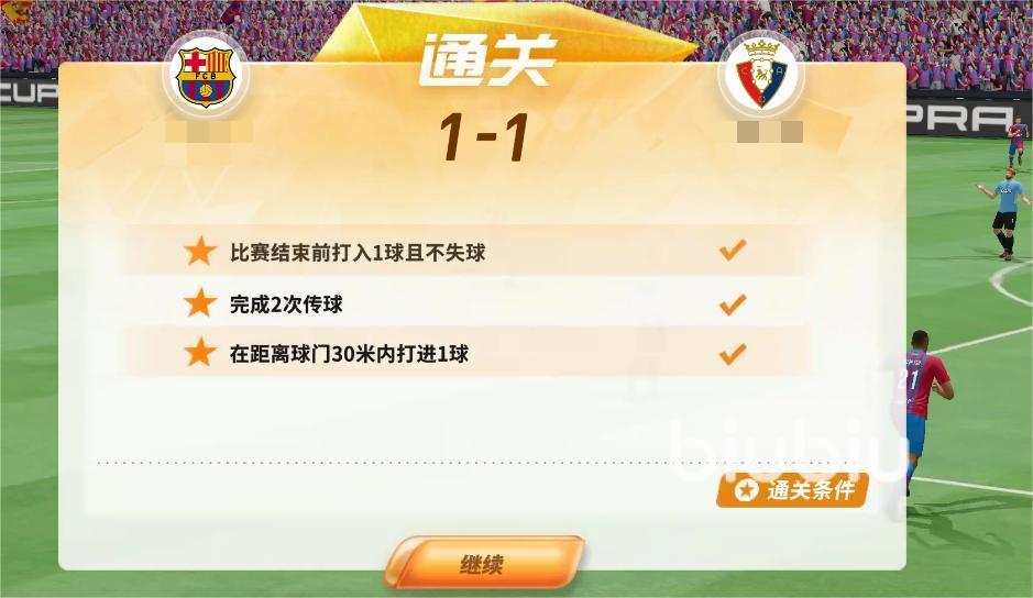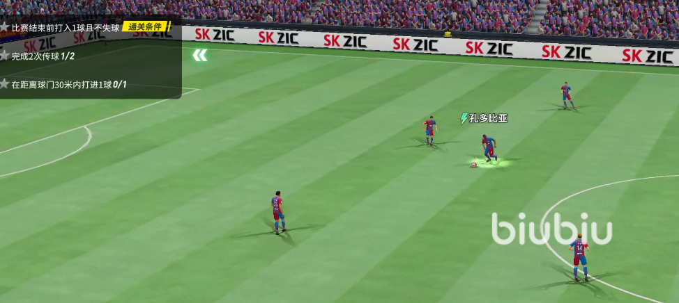 环球之旅需要玩家去多个城市地区踢比赛,整体玩法上,以闯关形式推进,因此每个关卡除了进球外,都有不同的额外胜利目标,对于这些目标玩家需要倾力完成,这样才能圆满的取得最终胜利。如下图所示,可以看到除了进球和不失球外,玩家还需要完成两次传球和一次远射才能拿到满星。
