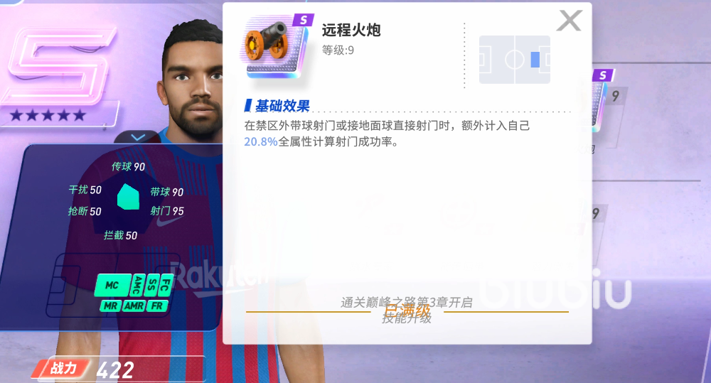 前期弄不到双S的话,可以试试招募单S球员代替,这一品质的球权出的概率足有百分之十五,也算是比较高的了,毕竟招募券前期可以通过签到免费得几十张。单S中比较推荐的一位是梅西亚斯,可以看到其射门属性高达95,并且核心技中也有增幅远射的远程火炮。