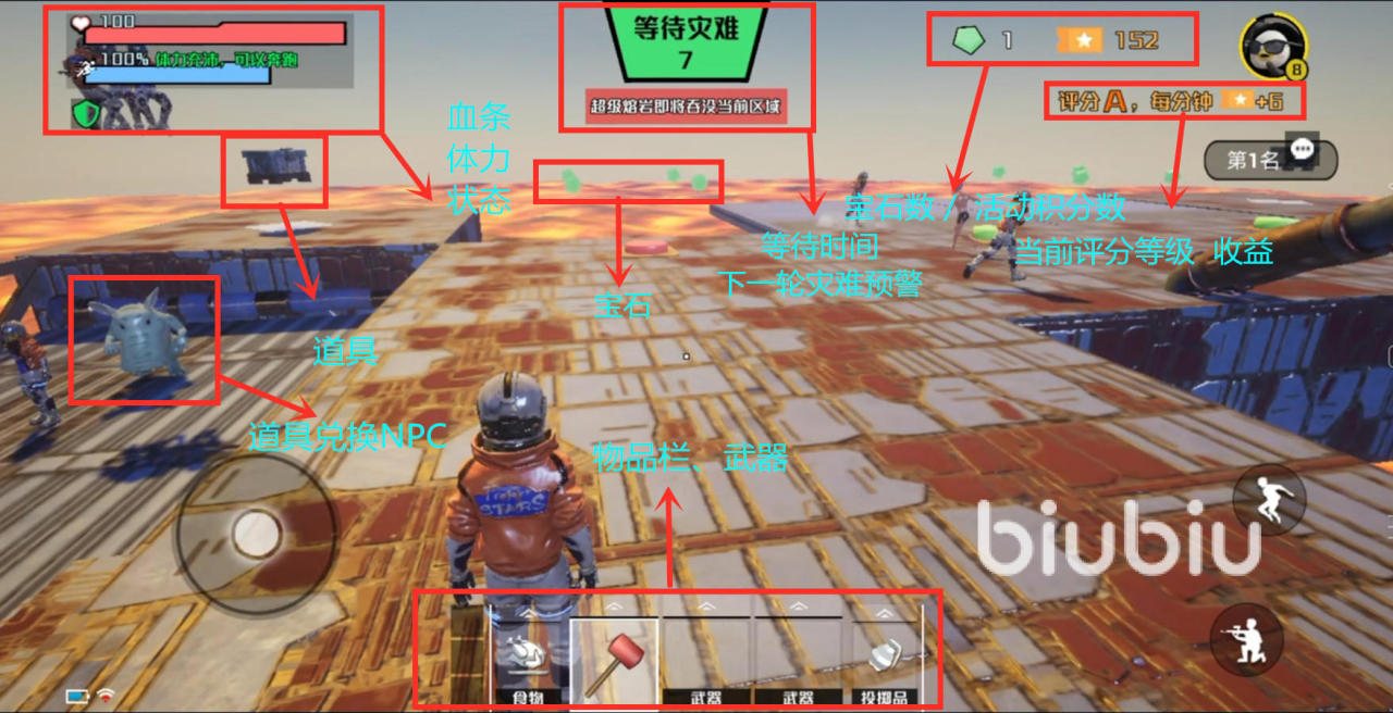 熔岩:地表下熔岩会往上蔓延,玩家需要逃到安全地方,否则会被熔岩灼伤,直到死掉,大家可以尽量往地图高出跑。