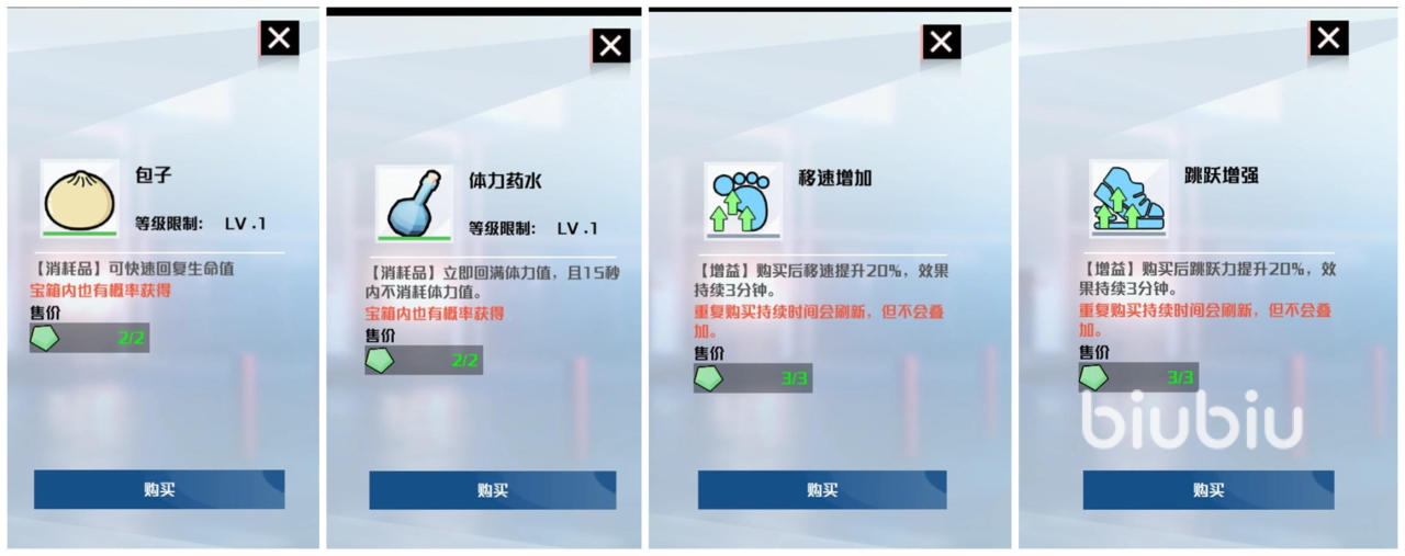 地图中有好几次道具点会更新宝箱,宝箱可以开出宝石和游戏内道具。包子道具可以用来快速恢复生命值,体力药水可以用来恢复体力值,这两个道具都有概率在宝箱中开出。另外还有两个移速增加和跳跃增强,则只能用宝石来兑换了。宝石除了可以通过宝箱获得,地图中另外还有固定的宝石更新点,大家可以多留意地图。
