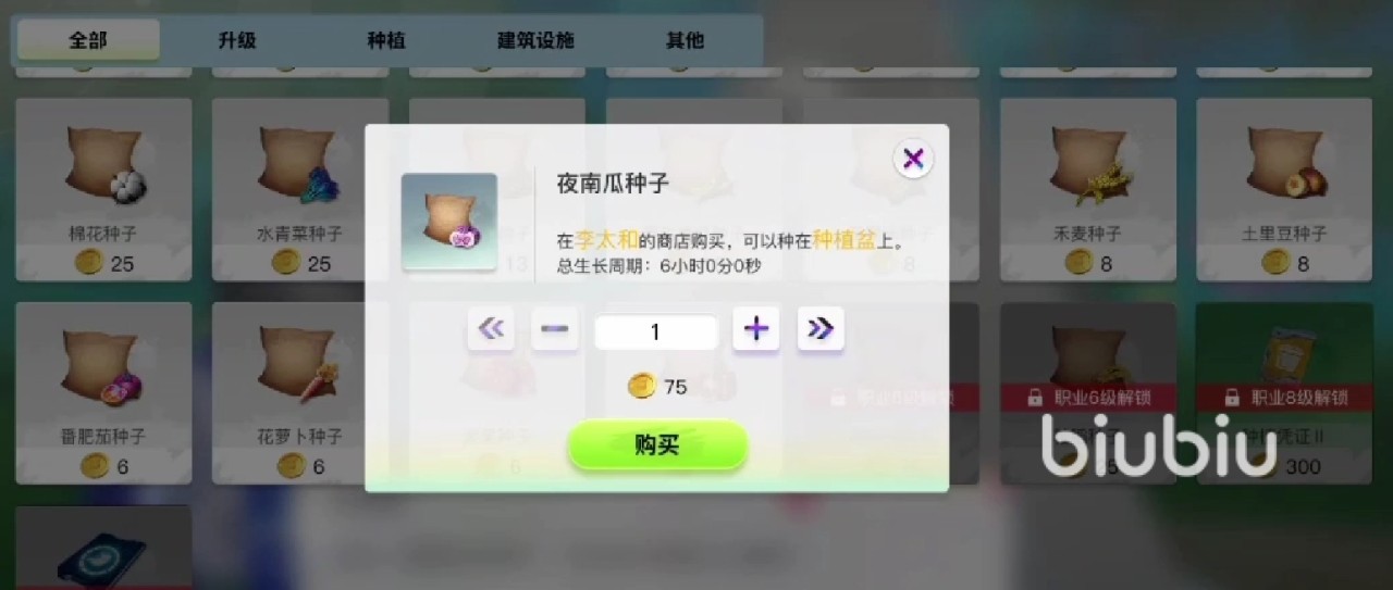 具体位置在东经50.72,北纬-13.95,在这个位置,有一个胖胖的专属NPC李太和等待着我们互动。我们接近与他对话即可,之后打开他的专属商店,就可以找到大量的植物以及种植方面的物品。往下翻,最底层就有我们的夜南瓜种子。不过需要我们的职业等级达到六级之后才能解锁,因此,比较推荐各位如果前期并不是特别紧急的话,可以刷一些职业等级之后再来购买。