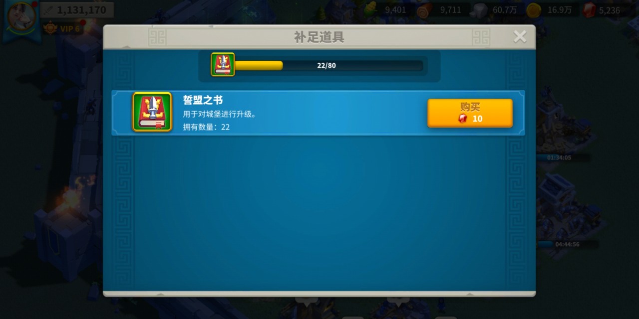 誓盟之书和抵抗之箭是非常稀少的传说道具,是升级城堡和警戒塔的必备道具,直接影响着玩家的部队集结力和城市防御力。如果玩家不幸错过了洛哈活动,就要消耗宝石购买以上两种道具,注意城堡和警戒塔的等级不能超过市政厅。