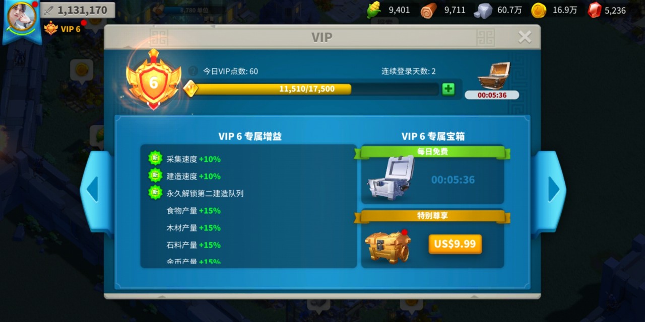 VIP等级是前期最急迫需要投入宝石的,这是由于VIP 6可以永久解锁第二建造队列,而从VIP10开始每天将获得一个传说统帅雕像。此外随着VIP等级的提高,玩家的科技研究速度、建造速度、行动力恢复等方面将获得大量加成,从而获得显著的先发优势,领先其他玩家。