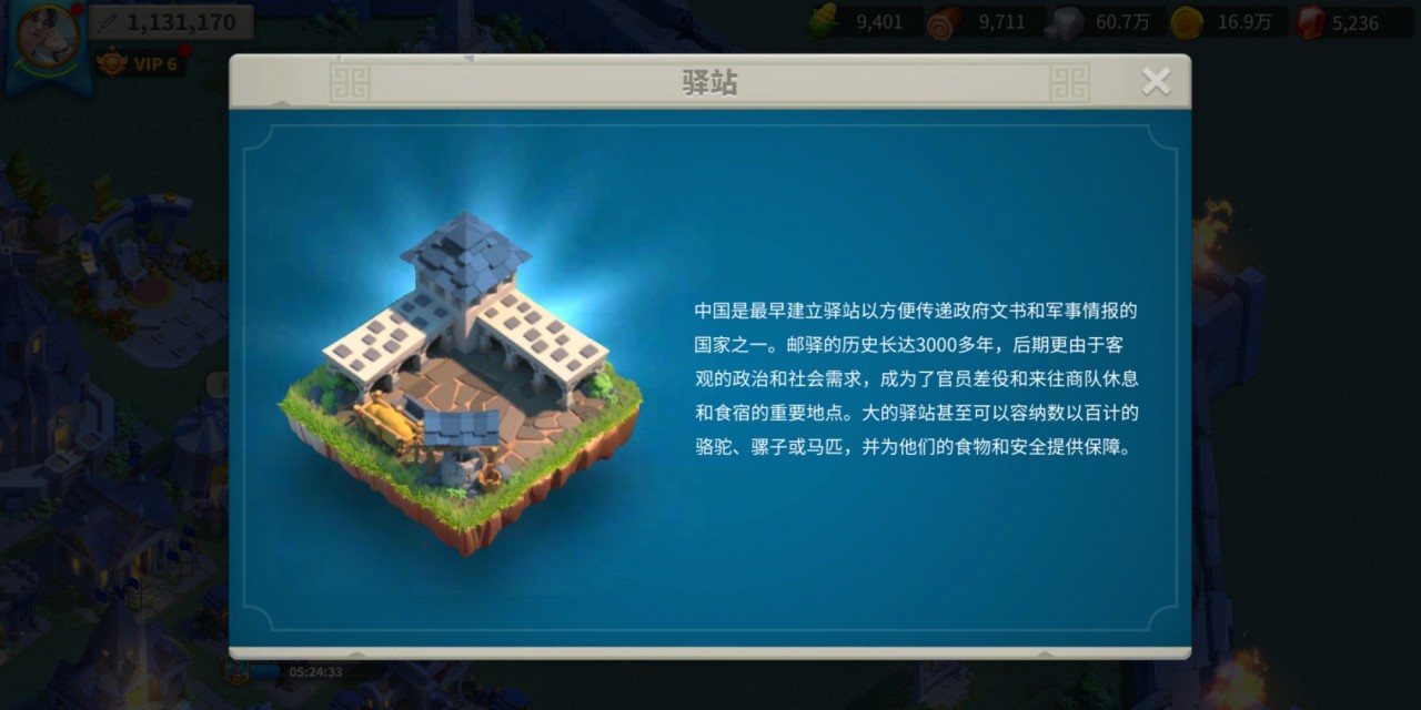 当玩家消灭野蛮人、研究科技、建造建筑及训练部队后,游荡在王国各处的流浪商人将进驻驿站。流浪商人会在驿站停留两个小时,同时会出售一些道具,建议玩家发现稀有材料盒、传说统帅雕像及文明变更券就要立刻用宝石购买。