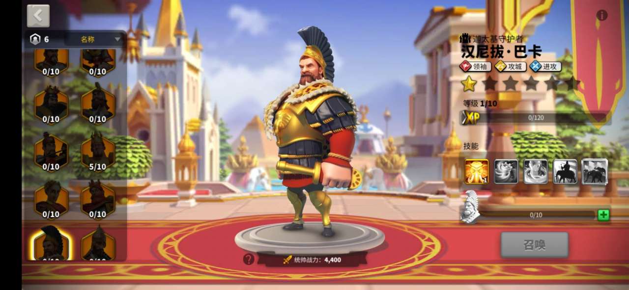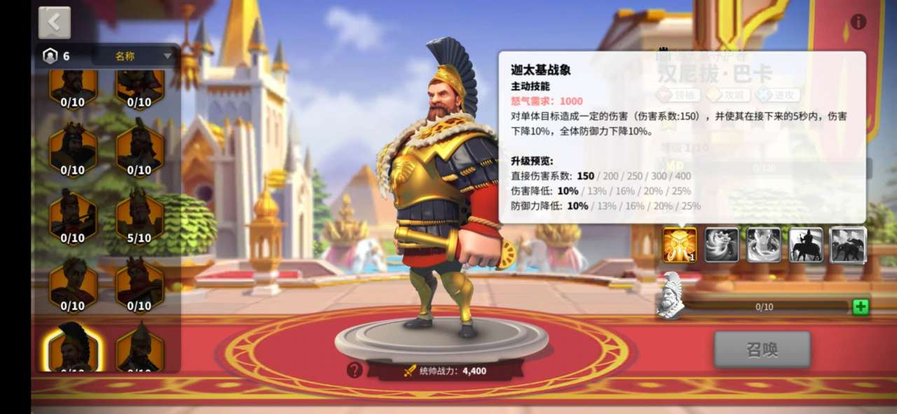 汉尼拔的技能有五个,分别对应的是一星到五星的五个级别。技能分别是迦太基战象、包围战术、围城、远征军以及万象齐踏。每一个技能随着等级的提升,说带来的伤害和增益呈递进式增加,最多能够提升5级。基本从技能能够看出来,汉尼拔的定位偏向于一个攻城类的统帅。