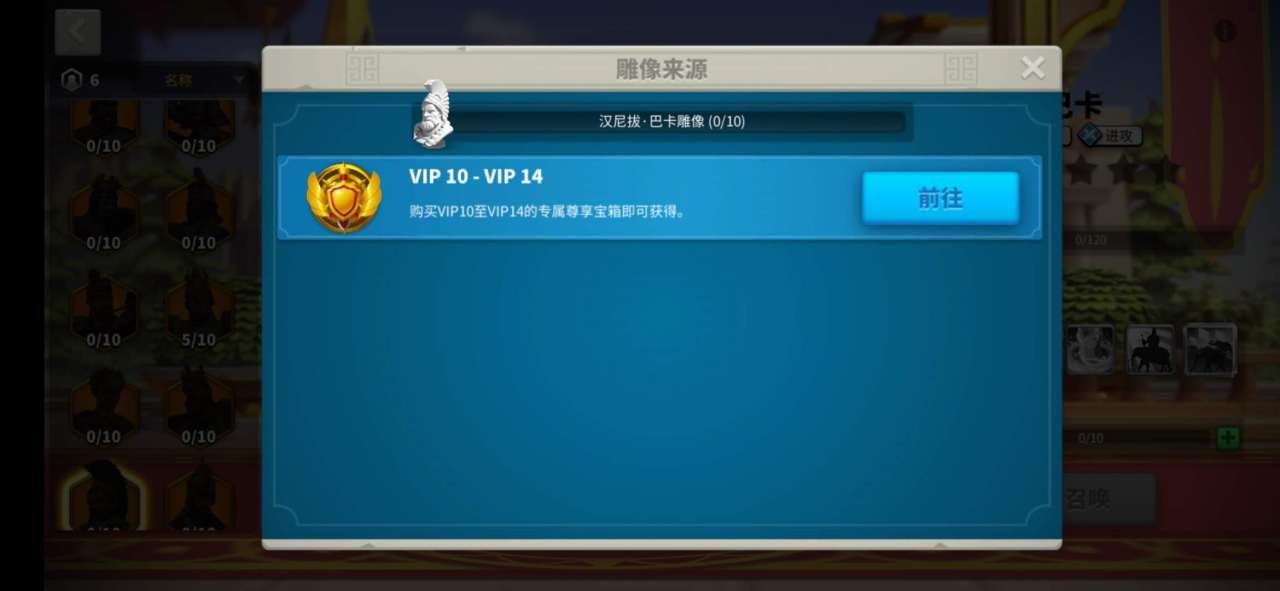 汉尼拔作为一个传说级别的统帅,其解锁的渠道以相对于苛刻。在游戏中想要获得这一个传说统帅,需要让玩家自身的VIP等级提升到10级,相当于一个氪金类统帅。VIP达到10级时会有一个宝箱,包含50个汉尼拔的雕像。玩家们需要注意游戏中的传说统帅雕像能够用于兑换传说级统帅,但是不包括汉尼拔在内,只能通过提升VIP等级来获得。