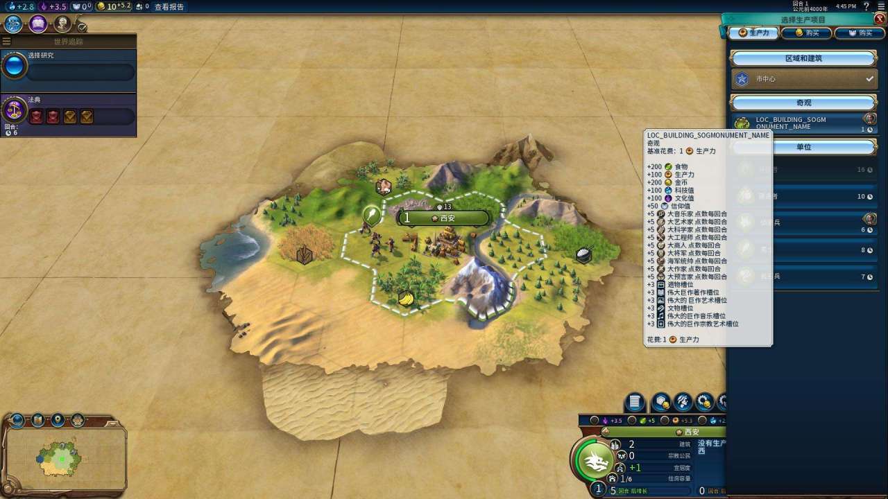2、注意关键页面和标值:进到游戏按住Y键,会看见每一个格子上呈现了一些小点,翠绿色点为食品数目,黄色齿轮为生产力,金色点为金币,这3个属性对开场特别关键。举个例子,每回合供给一个食品,两个生产力,一个金币,大象头这一个格子里面就产大象,是奢侈品特产。中央的是开拓者,他进行就能建立都市。都市的边境会主动扩大(文明值越好扩大越快),食品数目确定了人口数量,2食物会保持一人口,生产力标值越好,造物品越快,金币多了能够用于购买物品,因此这一些标值全都是越多越好。开场前,预期下食品、生产力、金币的标值,选个好位置进行,会使玩家有开场优点。鼠标点页面的都市,右下方会呈现1个框,这一个框特别关键,是微操的重点对象。点了右侧的选择出产新项目后,会呈现1个建造列表,列表统计数据展示纪念碑要十三个回合才可以造好。它是怎么得出回合数的呢?页面上会显示造这一个纪念碑要耗费的生产力,将它除以目前得到的生产力,就是回合数。