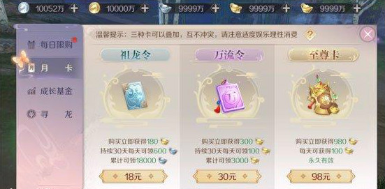 说到买入游戏道具,就一定要说“完美世界”手游中的三项模式了,TA们一共是“每日限购”、“招财进宝”和“成长基金”。招财进宝有三种类型,相应的价钱也不同,就拿“至尊卡”来讲,买入后便可得到980金元宝,后面无限期每天能够稳定获得100绑定金元宝,按照收益来讲是很丰厚的。