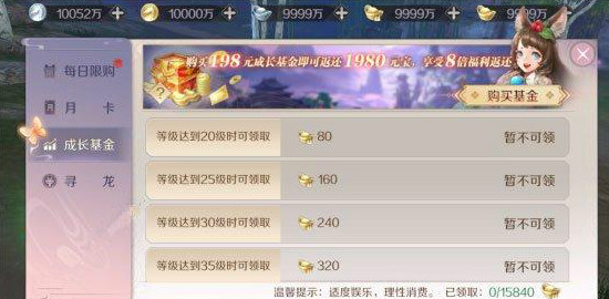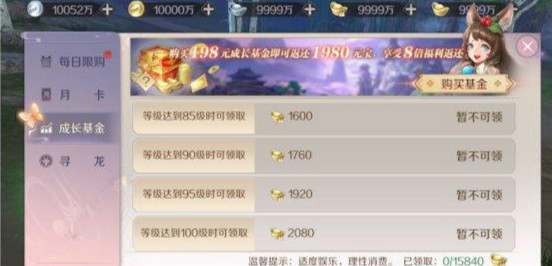 “成长基金”类似日常生活中的保险,只要大家耗费198RMB买入后,便可返回1980金元宝,以后每当玩家的级别到达要求的时候,就能从成长基金界面获得相对应的绑定金元宝奖励,这个奖品的力度是很高的,55级前是10倍返还,55级后是8倍,假如大家可以升至100级,那将能得到15840个金元宝,这会是一笔十分值得的交易哦。