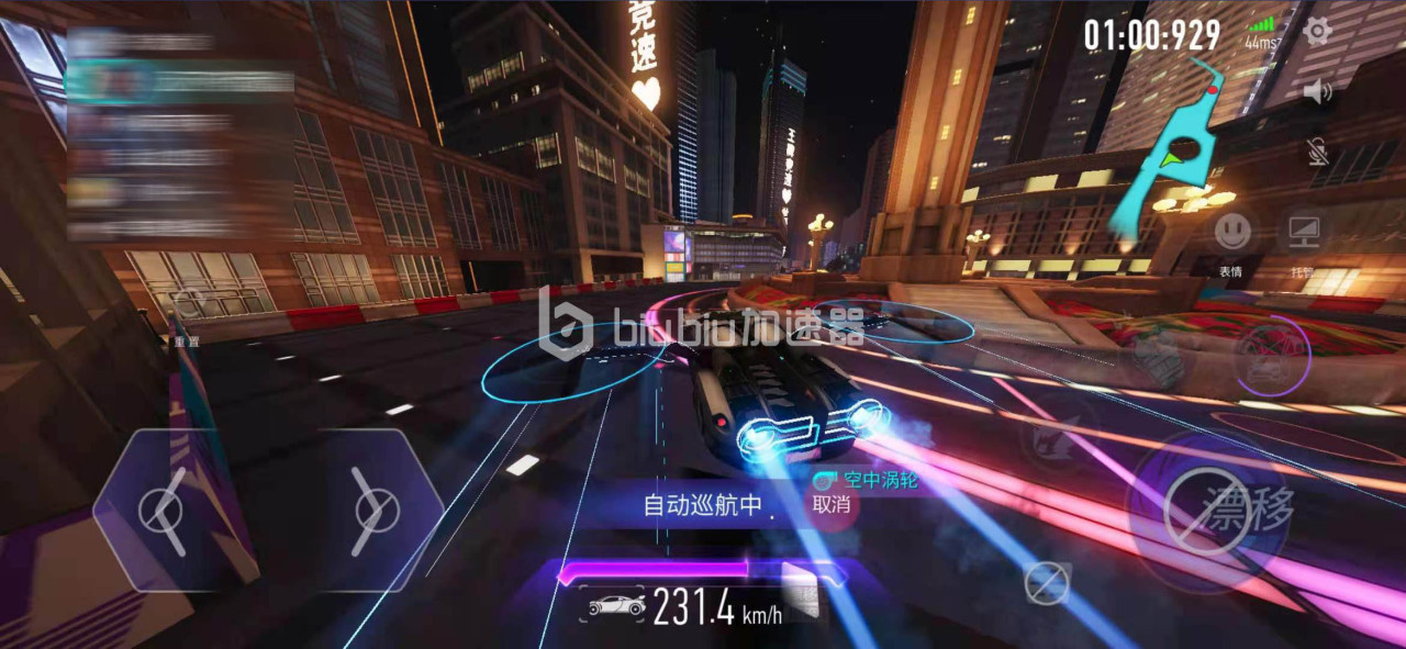 触发涡轮的原理就是进行漂移,结束的时候按一下反方向键,接着接上紫色喷射。此时,需要选择一个拥有跳板的关卡。当成功触发紫色喷射的时候,继续接上一个蓝色喷射,这时候会一直进行加速,加速的时间还是挺长的,这时候再继续在弯道里面多接一个紫喷。