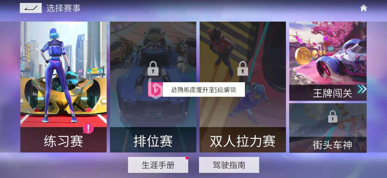 想要解锁耐力挑战赛,你的熟练度就要抵达五级。所谓的熟练度就是对这游戏的熟悉程度,刚开始只需要在练习赛里面多玩几把,就能顺利升级熟练度。不过熟练度也不是那么好提升的,需要不断地赢下比赛胜利。并且打出高光操作,就能迅速提升熟练度。