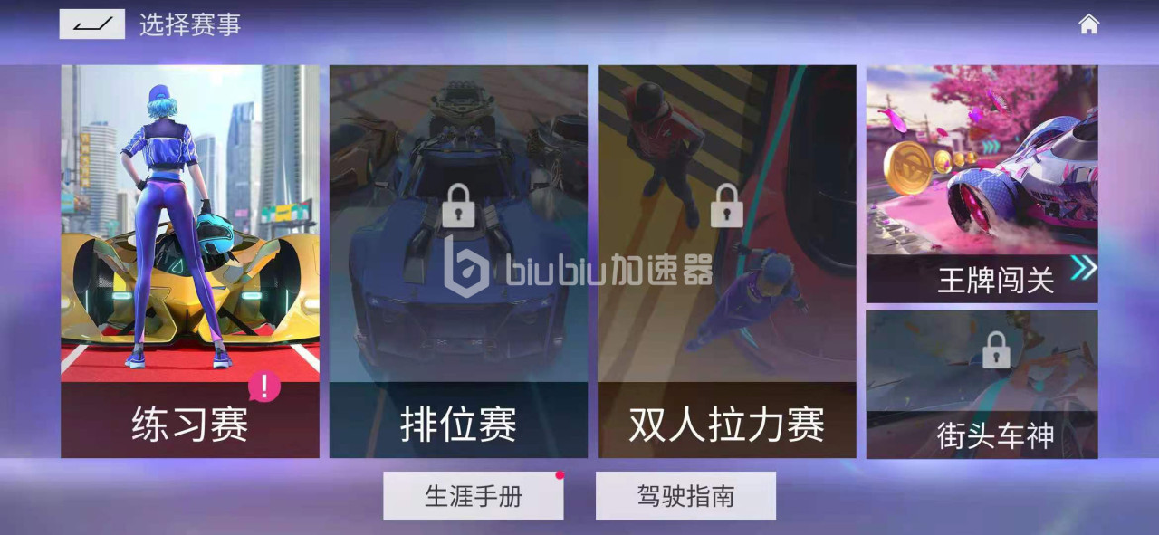 当你刚接触这个游戏的时候,自然不想去打排位赛,因为那会很容易掉分,并且让你的战绩变得不好看。这时候可以去打练习赛,练习赛能够随意选择一个地图并进行比赛。可以在游戏主要里面点击最右下角的前往速度节,接着点击最左边的练习赛,可以自己创建小队,也能迅速组队,之后就可以在里面练习漂移。