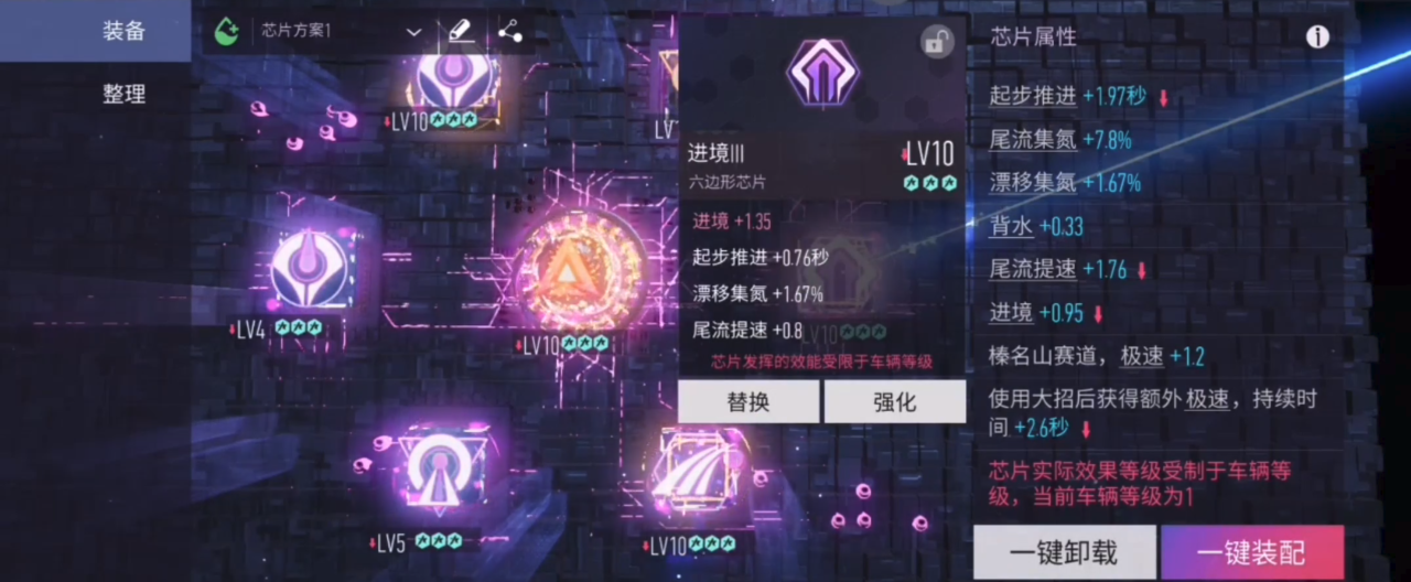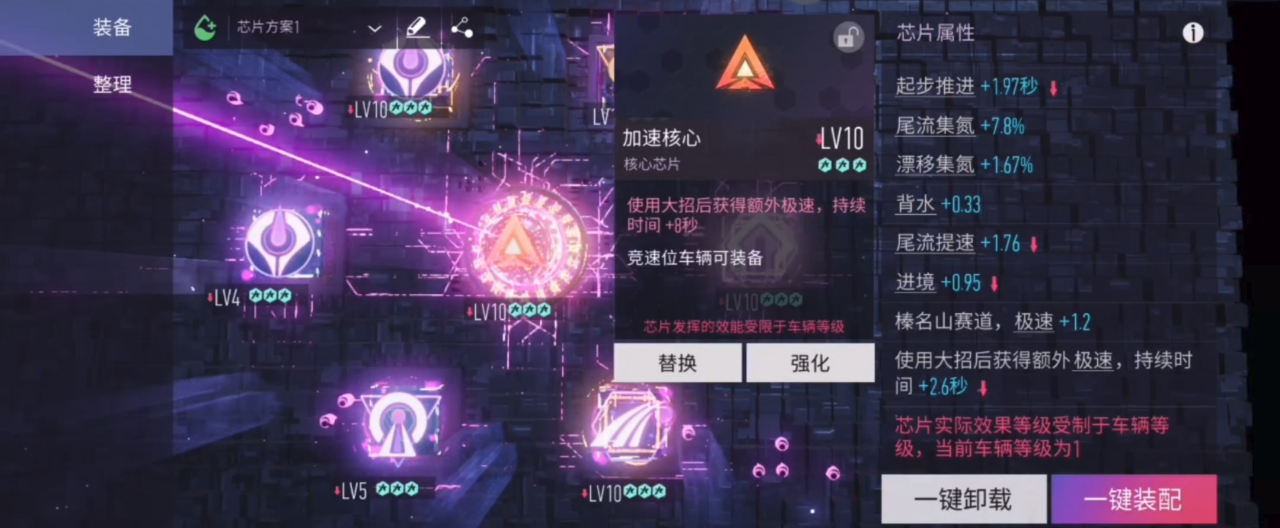 虽然这样的芯片搭配会比较频繁的点击氮气按钮,但是这样也会给我们的速度带来一个很客观的提升。小编在实际测试中发现,使用这套芯片之后一般第一个弯道就会直接将大招攒满,这对接下来的比赛是非常有利的,所以很推荐各位小伙伴们去试验一下。