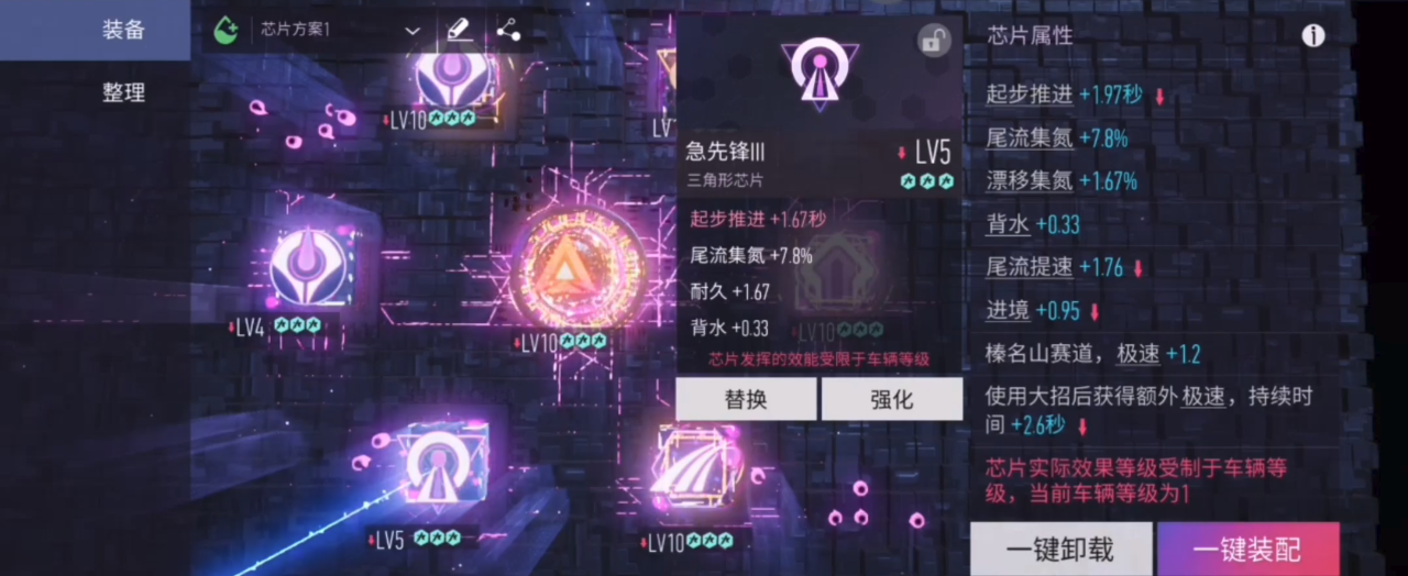 阿斯顿马丁这辆车的芯片搭配比较简单,因为这辆车的特性很好,氮气积攒速度超级快,所以我们的氮气芯片就带2X3的氮气,这样可以保证氮气输出效率最大化。芯片方面小编建议大家带急先锋3、边境3、逆流3、加速核心和动力芯片3,因为我们选择了2X3的氮气模式,所以搭配这样的芯片就会非常容易积攒起氮气槽。