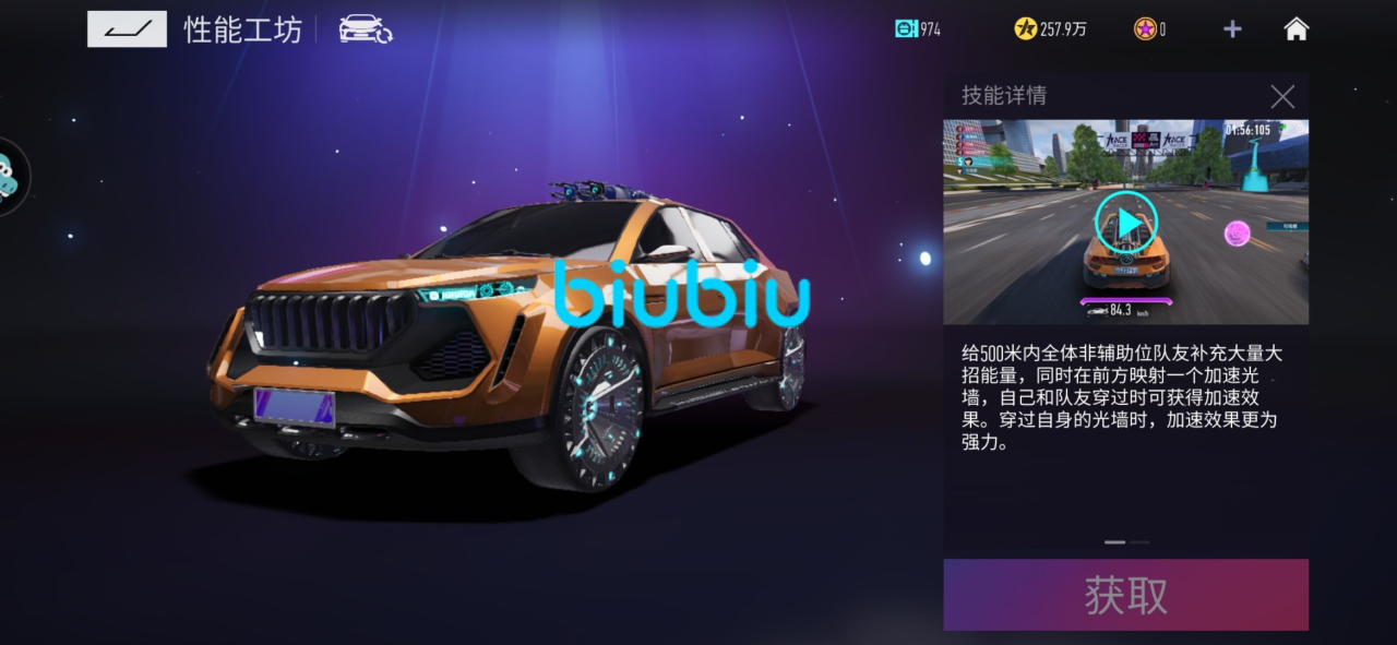 我们先来说一下催化剂这辆车的整体性能还是很不错的,是一辆四驱的越野车,漂移起来手感一般,推头稍微有点严重。我们在开局的时候可以无视充能释放一次大招,但是本局比赛的最高速度会减少十千米每时,另外它的大招可以给附近五百米内的所有友方非辅助位的车辆充能大招,这个技能在团队赛的时候简直是加速利器。最后这辆车的获得方法也很简单,只要我们买了通行证,就能获得一辆了,是不是非常方便呢?