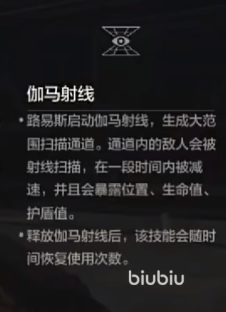 然后他的二技能释放之后可以启动伽马射线,朝着前方形成范围很广的扫描通道,若是被射线成功扫中的话。那么就会暴露所有敌人的位置,并大幅度地削弱敌方的速度、生命值以及护盾值。这样的好处就是可以侦查到周围的敌人,另外还能削弱对方的能力。为队友后续的进攻提供更多可靠的优势,可以说是一个非常强大的辅助技能了。当然释放伽马射线后,随着时间的流逝,会自动恢复可以使用的次数。所以说大家尽量在开战之前叠满次数,避免可使用次数太少。