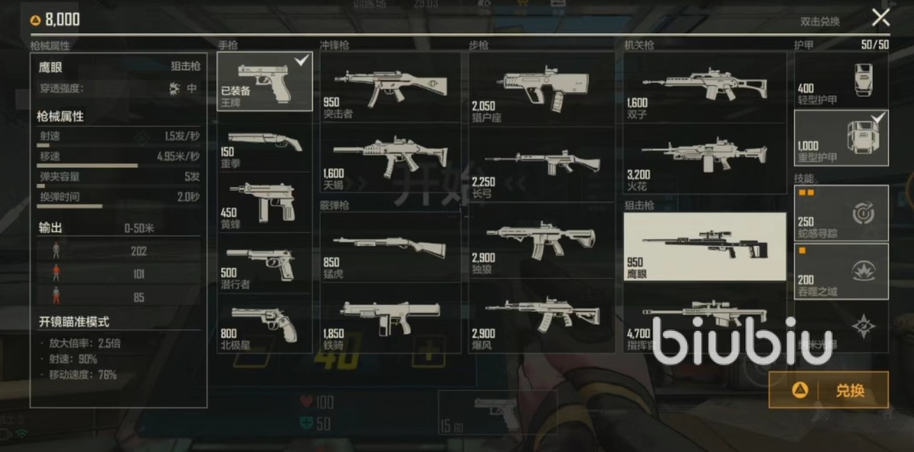 鹰眼是游戏中的狙击枪类型,它具有中等程度的穿透强度,这一点就比手枪和冲锋枪要强很多。在枪械基本属性方面,射速比较慢,为1.5发每秒,移动速度为4.95米每秒,弹夹容量5发,换弹时间两秒钟。对于狙击枪来说,射速和弹夹容量以及换弹时间都是不重要的属性,只要移动速度能够跟上,其他都不是问题。