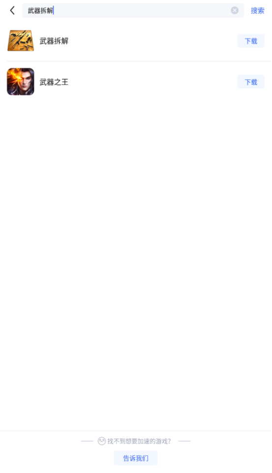 打开Biubiu加速器后,在上方搜索栏中输入要查找的游戏名——武器拆解,下方就会显示搜索结果,找到游戏后轻轻点击右侧的下载按钮,立刻开始下载。