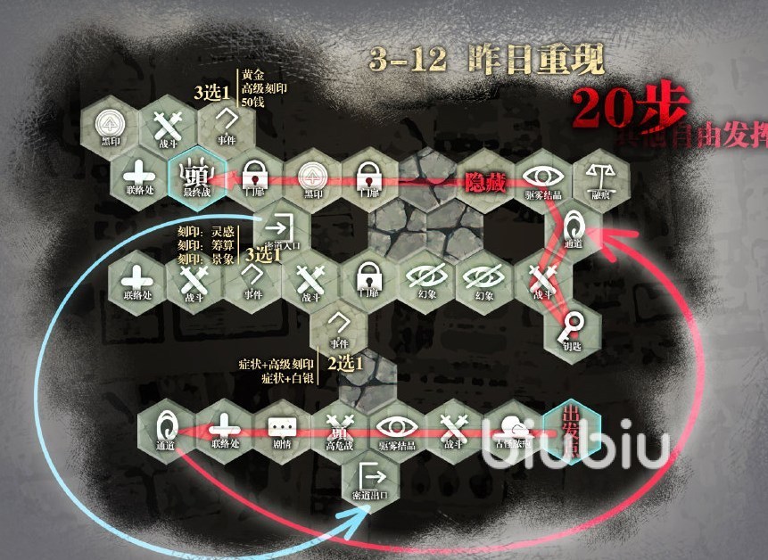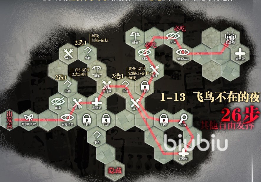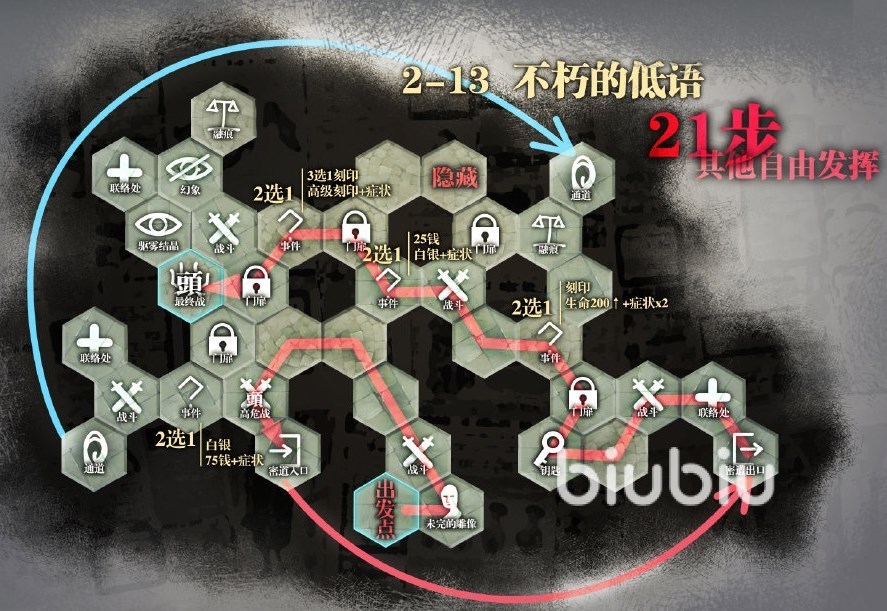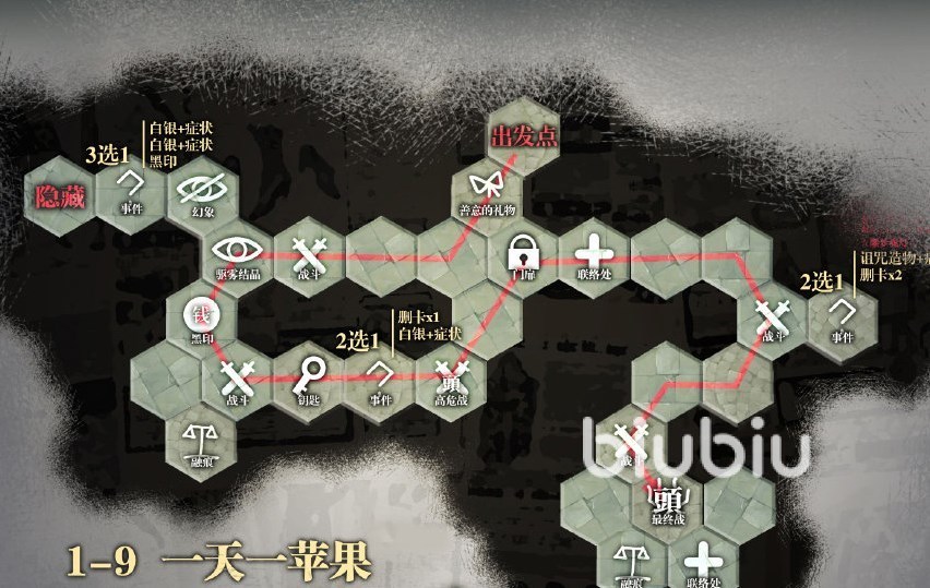 从出发点启动,左下方经历善意的礼物、战斗、驱雾结晶、黑印、战斗、钥匙、事件,绕一圈后再往右侧移动。最右边的诅咒造物可以选择不触发,完成战斗后直接向下再接一次战斗后,抵达最终战。