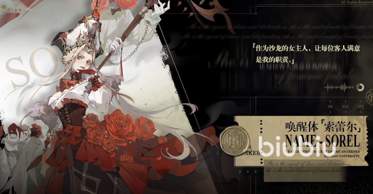 玩家们也可以称呼她为红女王,是血肉界域当中ssr稀有度的角色,只能通过角色活动唤醒获得,是限定池子专属的角色之一。作为沙龙的女主人,身上点缀的大量的玫瑰花朵以及血红色的长袍便是其最标准的人物特色,搭配上华丽的王冠,给人带来非常深刻的印象。