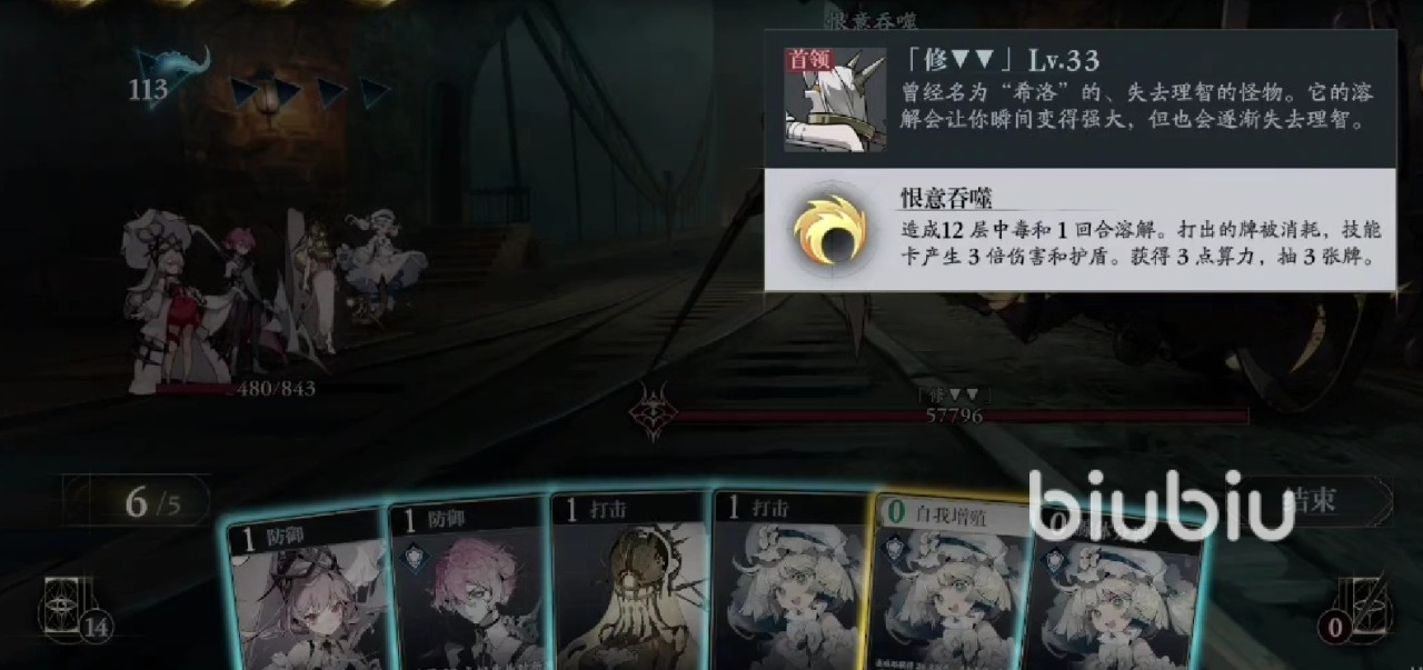 最后就是boss战,打曾经名为希洛失去理性的怪物。他的特殊buff恨意吞噬,造成12层的中毒效果和一层的溶解打出的牌将会被消耗技能卡将产生三倍的伤害和护盾,获得三点的算力,抽三张牌。要想更好通关的话,尽量还是保证自己拥有足够的单体输出才可以,而且由于是长线作战,充能和护盾方面必不可少,至少得有1到2个前排在前方帮我们获得更多的护盾加成。