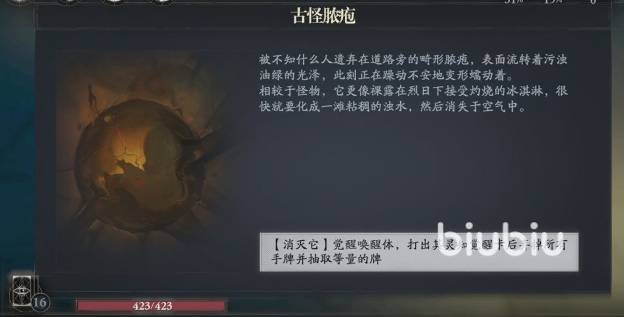 游戏的第三章名为谨防恶犬,会遇到各种各样的事件,比如说会出现新的怪物古怪脓包。它是一种不知道被什么人遗落在道路两旁的畸形脓疱,表面上流转的污秽绿油的光泽,此刻正在躁动不安的蠕动着。消灭它,可以觉醒我们的唤醒体,打出其灵芝,觉醒卡后,弃掉所有的卡牌,并抽取等量的卡牌。