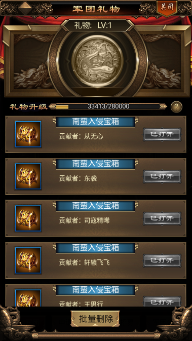 (3)军团礼物:加入军团后可以每天得到军团宝箱,宝箱可以通过购买礼包、参与特定副本、活动、每日首次占城、占领都城、军资宝箱获得。