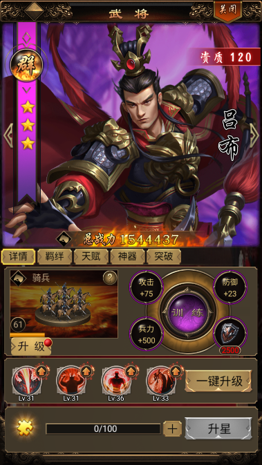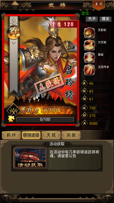 2、吕布:武将定位输出、先手、核心,吕布是一个前期伤害非常高的武将,放在这个队伍里再合适不过,免疫控制可以让他更快的输出。