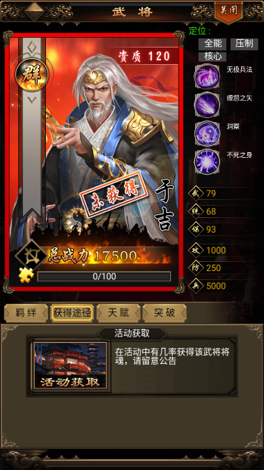 3、于吉:武将定位全能、压制、核心,于吉也是一个可以降低敌人抗性的武将,而且爆发伤害高。也不怕激活攻击,毕竟可以复活。