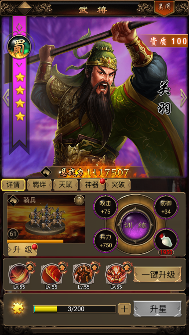 2、天命关羽的天赋和突破也是非常的优秀,可以说是目前游戏中最强的输出单位(没有之一),毕竟也是游戏中唯一的130资质,也算是对普通关羽不强的一个补偿。