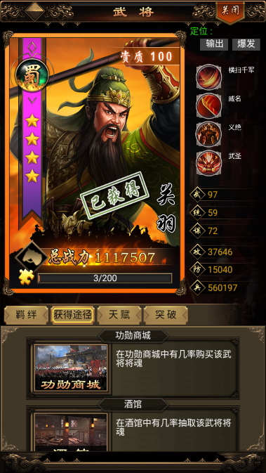 2、关羽的天赋和突破效果还是不错的,不过技能的整体强度稍低,因此即使是在100品质武将中强度也是偏低的,不过好处是获取难度较大,因此在基础属性上会有优势。