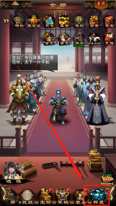 (1)群星:群星是主公内政中的一个玩法,该玩法的主要道具就是将星。群星模式一共分为五大部分,分别是无双魔神、星火燎原、中流砥柱、江东虎踞、赤壁分流。