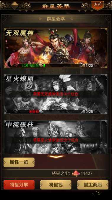 (3)将星:将星就是用来解锁上述各种组合的,每一个将星都会增加一定的属性,集齐一套将星后将会有额外属性加成。在获得将星之后点击该系统界面的一键激活即可,多余的将星可以进行分解,分解后可以得到“将星之尘”。