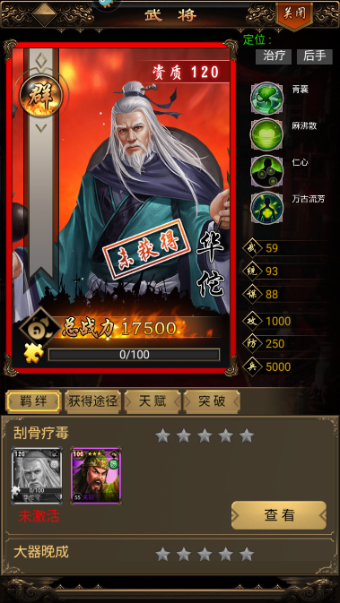 2、武将特点:华佗的大招治疗效果虽不及羊祜,但是其回复没有副作用,而且攻击敌人还带有减溢效果。即使华佗败退依然能为队伍提供大量治疗(大于羊祜两个大招的治疗量),因此华佗是不怕切后排类武将的。综合来看华佗绝对是本游戏最值得的辅助类武将,不过由于有阵营加成的关系,因此每个系列都要有一个。