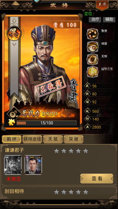 2、武将特点:鲁肃的大招拥有全体持续治疗能力,综合治疗能力已经算是顶尖的了,而且还能解除队友的控制效果。保护前排的能力也是不错的,而且自身的怒气恢复很快,保护力MAX。