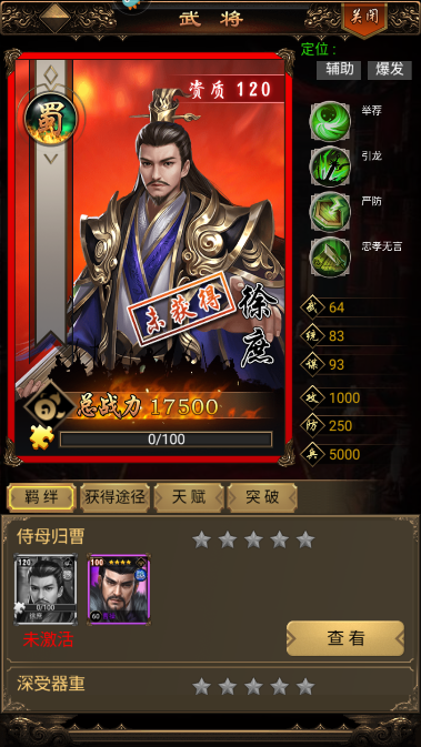 2、武将特点:徐庶的大招可以直接恢复我方单位的怒气并提升伤害,可以大幅度提升队伍的输出。徐庶自身还能免疫控制和加快回复怒气,大招的释放会很频繁。