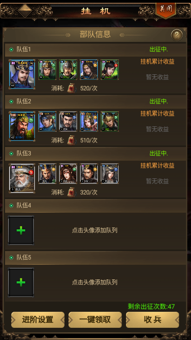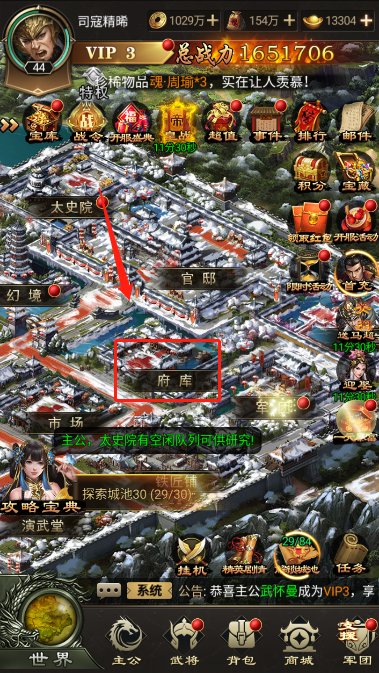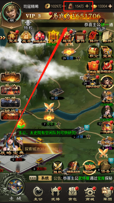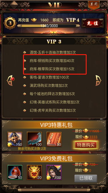 2、提升VIP的等级可以增加购买铜钱和粮草的次数,免费次数同样会增加,这款游戏可以白嫖VIP,而且非常的容易。
