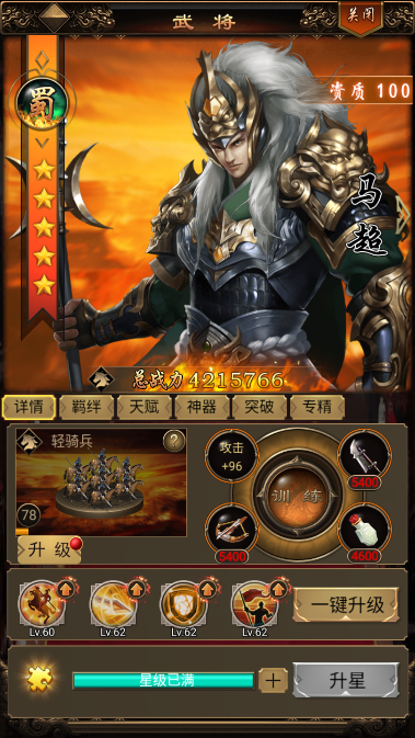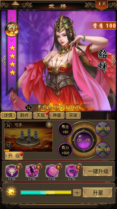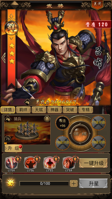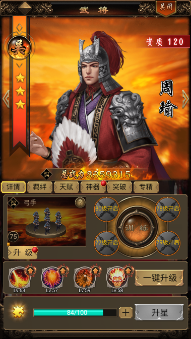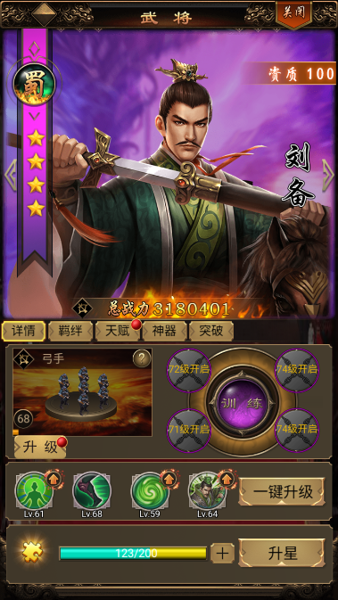2、阵容分析:100资武将是游戏中期的最强阵容,攻守兼备、百战百胜,即使到了后期个别武将也是非常强势的。