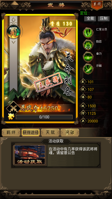 1、活动获取:参考天命关羽的获取方式,基本都是在游戏中的活动获取,主要还是要看更新内容。大家还是多存些元宝把,一个天命系武将需要10W加元宝。