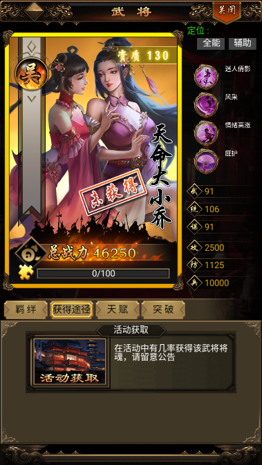 (4)吴国:天命孙尚香武将定位输出、爆发;天命大小乔武将定位全能、辅助。