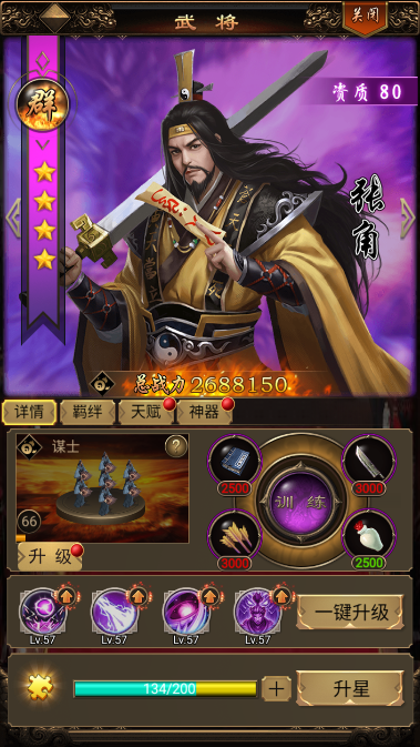 2、萌新阶段就不用分国家了,使用初始赠送的80品质紫武将可以帮助萌新很好度过前期阶段,不过不作为主力培养,培养到前期阵容出来就够了。