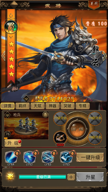 2、首冲会赠送一个四星的关羽,游戏前期也能领取一个马超。赵云是新区卡池限时武将,很容易就能培养到满星。刘备在第三天可以通过传记模式获取,剩下的一个位置大家可以按照需求自行选择,可以说是前期最简单也是最实用的国家。