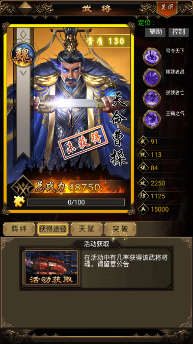 2、作为新出的130资质武将还是非常有特点的,天命曹操自身基本没有属性能力,但是控制能力独一无二,而且是时间越久强度越高的武将。