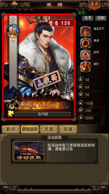 1、郭嘉在游戏中的定位算是先手、压制。