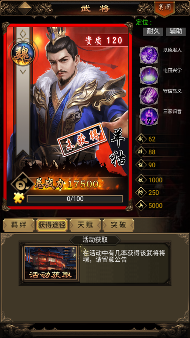 1、羊祜在游戏中的定位算是全能、压制、核心。