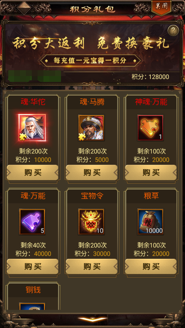 1、活动期间,每充值1元宝获得1积分,赠送元宝不计入积分。使用积分可兑换丰厚奖励,每日0点重置兑换次数。